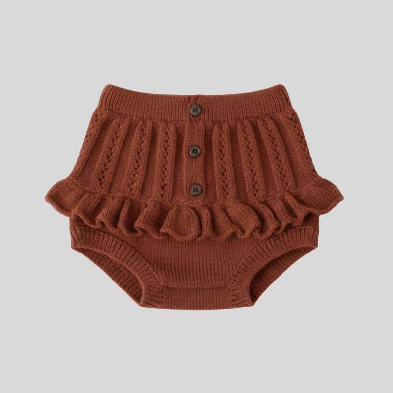 La prenda "Blommer Tejido con Olan" es un conjunto de prenda de bebé en color rojo, confeccionado con un tejido suave y cómodo para la piel. Presenta un diseño de punto con detalles de trenzas verticales que agregan un toque elegante y texturizado.