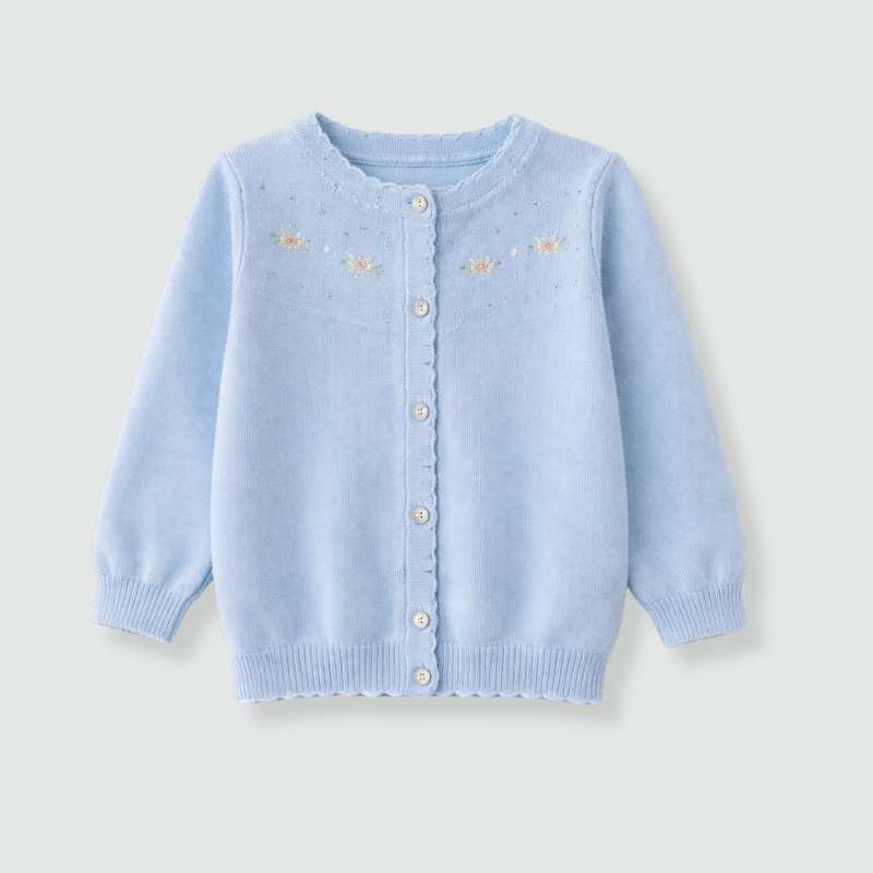 Cárdigan infantil en tono azul cielo, confeccionado en tejido de punto suave y agradable al tacto, ideal para mantener a tu peque cómodo en días frescos. Presenta delicados bordados florales en el delantero y pequeños detalles tipo calado que le dan un acabado fino y elegante.