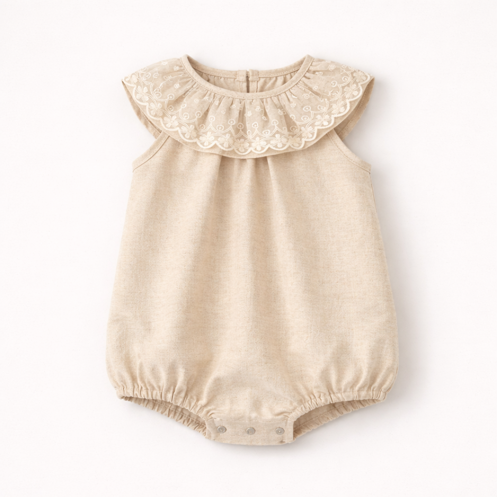 El corte amplio y la cintura elástica aseguran facilidad de movimiento y comodidad, mientras que los botones en la parte inferior facilitan el cambio de pañales, haciendo que sea tan práctico como hermoso.