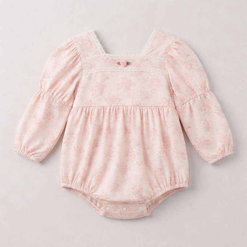 Confeccionado en un suave y delicado tono rosa, presenta un hermoso estampado floral en tonos de rosa claro y un toque sutil de verde, que aporta un aire fresco y tierno. El romper tiene un diseño encantador con un cuello cuadrado adornado con un delicado encaje blanco, mientras que el botón decorativo en la parte superior central añade un toque extra de dulzura.