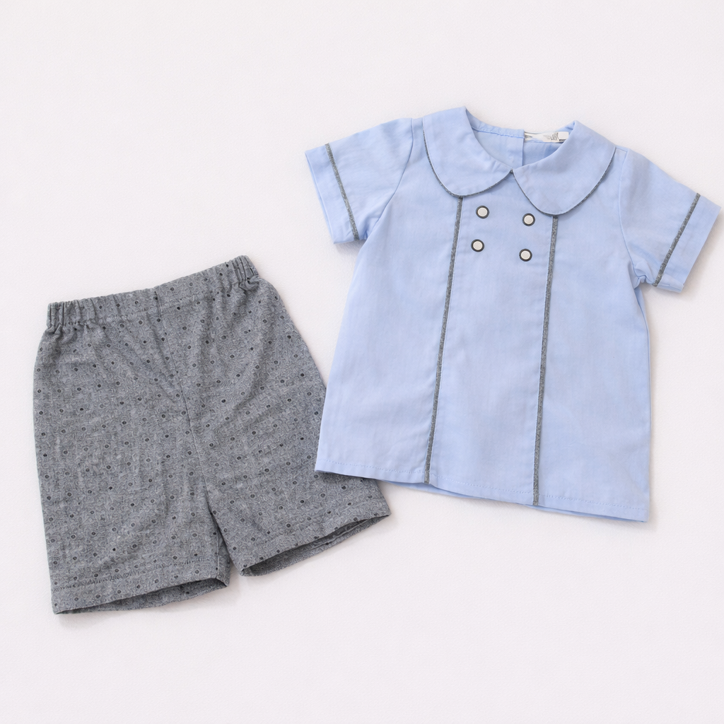 La camisa en tono azul claro presenta un delicado cuello redondo con solapa suave y una botonadura decorativa al frente que aporta carácter y distinción. Los finos vivos verticales estilizan el diseño y refuerzan su estética clásica. Se complementa con un short en tono gris jaspeado, de textura sutil y corte limpio, logrando un equilibrio perfecto entre sobriedad y encanto infantil.