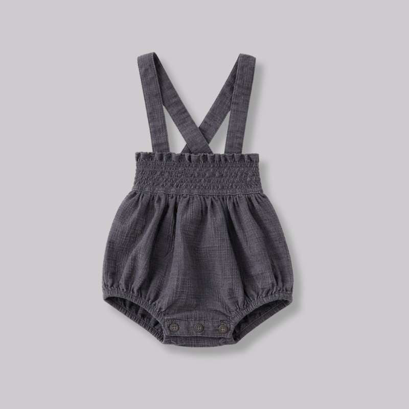El diseño incluye una cintura fruncida que se adapta con suavidad al cuerpo, mientras que la parte inferior estilo bombacho tiene piernas elásticas para mayor comodidad. Además, se incluye un cierre a presión en la parte inferior para facilitar los cambios de pañal. Es ideal para usar solo o con una camiseta debajo, creando un look práctico y elegante.