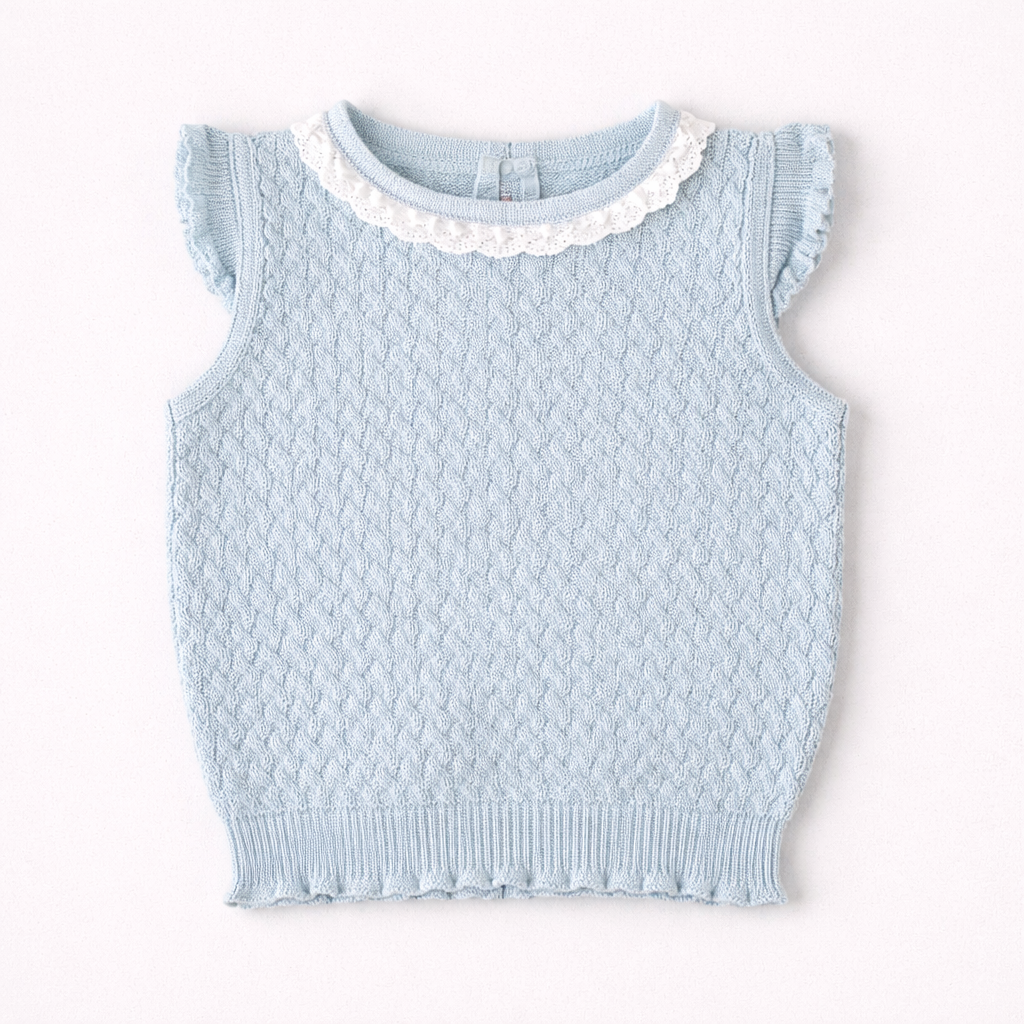 El color azul suave aporta una sensación de tranquilidad y frescura, mientras que el diseño tejido en punto le da una textura encantadora. Los detalles de encaje blanco en el cuello le dan un toque romántico y delicado, mientras que las mangas con volantitos añaden un detalle femenino y juguetón.