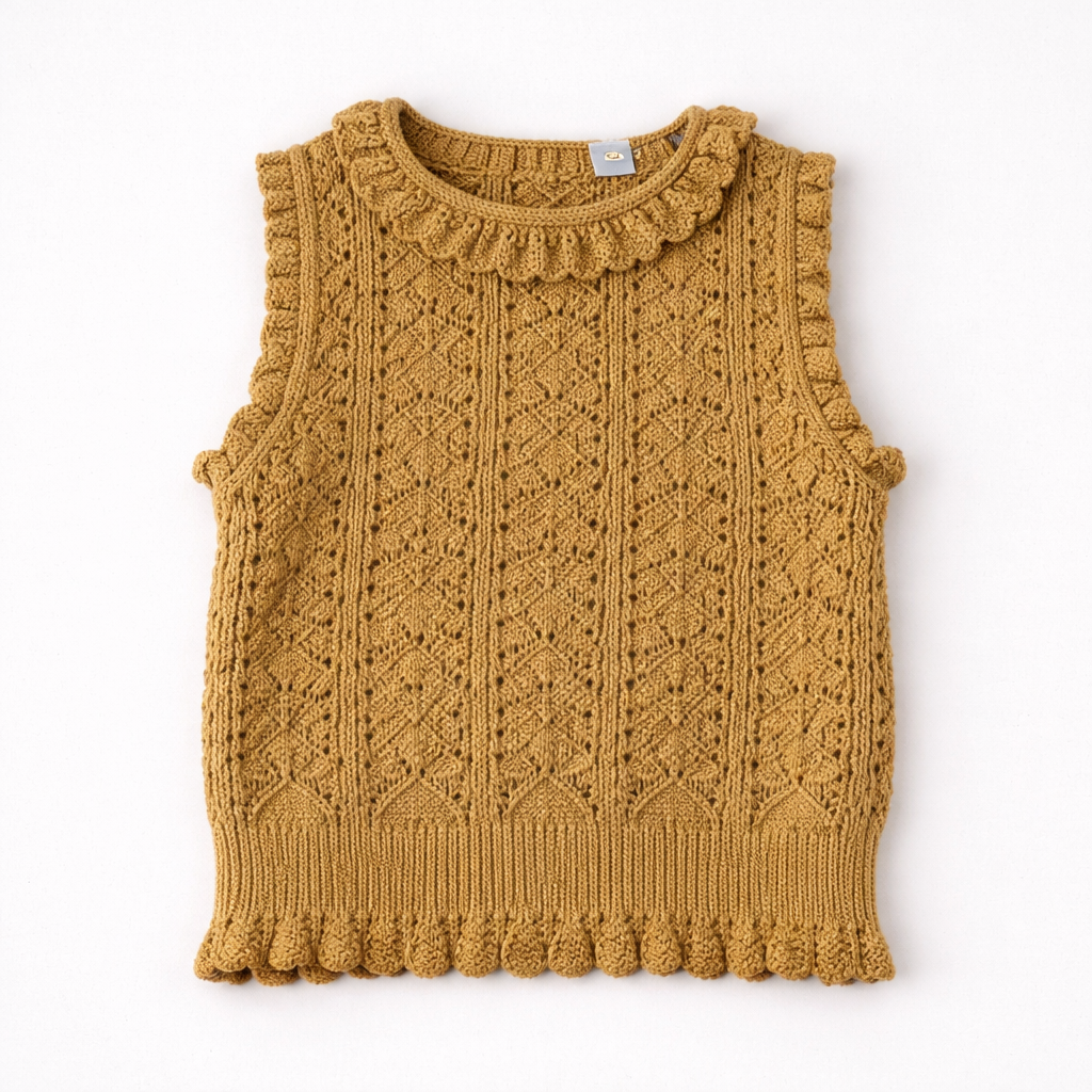 Su diseño con detalles en el ribete y el patrón calado en la parte frontal le da un toque sofisticado y moderno. El color mostaza cálido aporta una sensación acogedora y es perfecto para combinar con otras prendas básicas o más elaboradas.