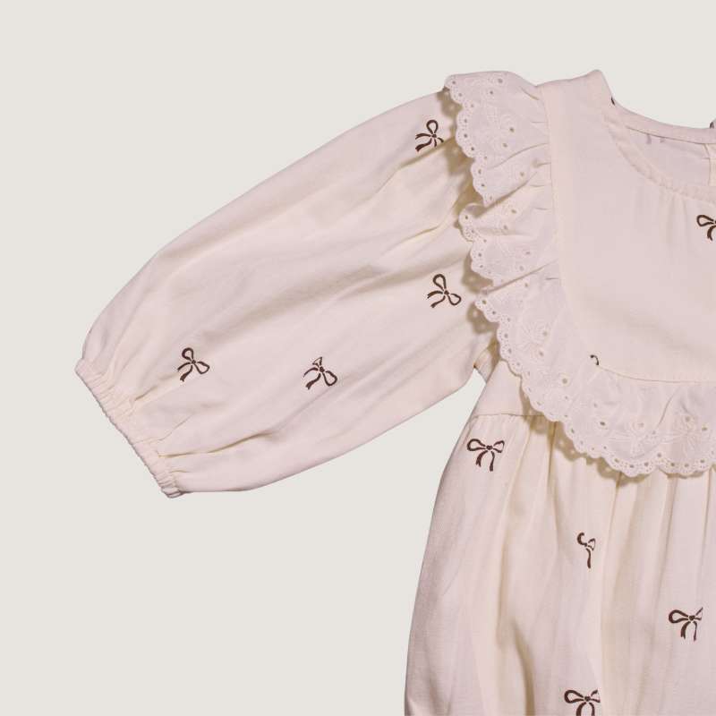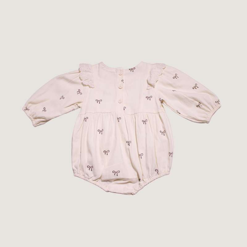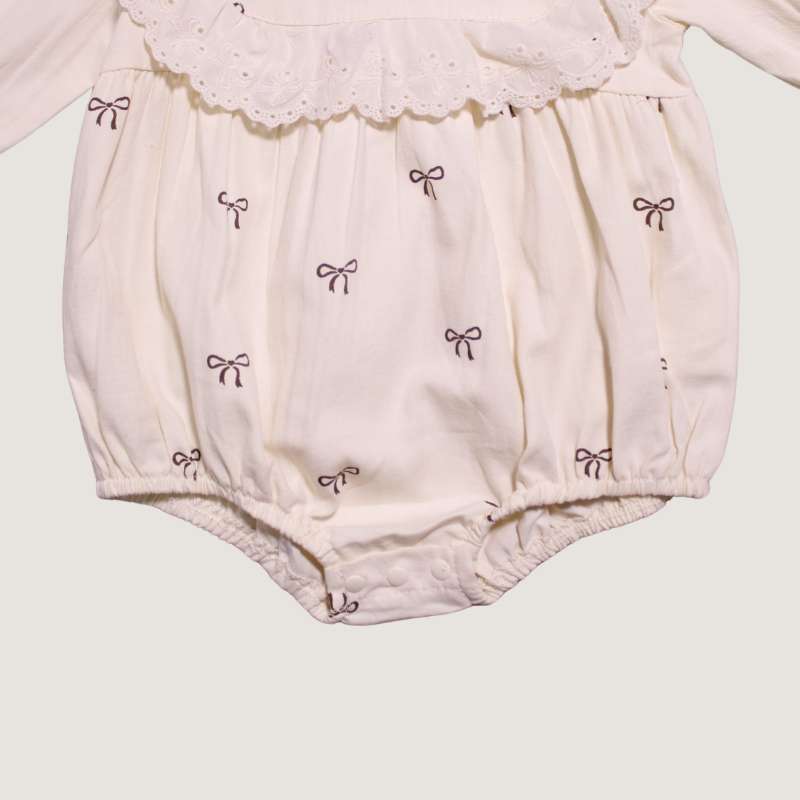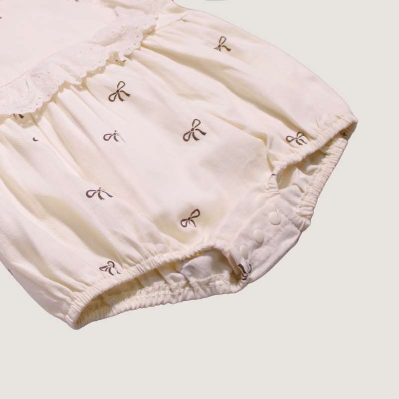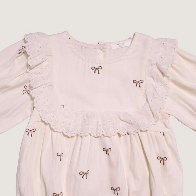 En un tono marfil natural, este pelele destaca por su pechera con volantes de encaje calado y un estampado de pequeños moñitos en todo el tejido, que le aportan un estilo tierno y refinado. El ajuste bombacho, las mangas largas y los broches inferiores aseguran comodidad y practicidad sin perder elegancia.