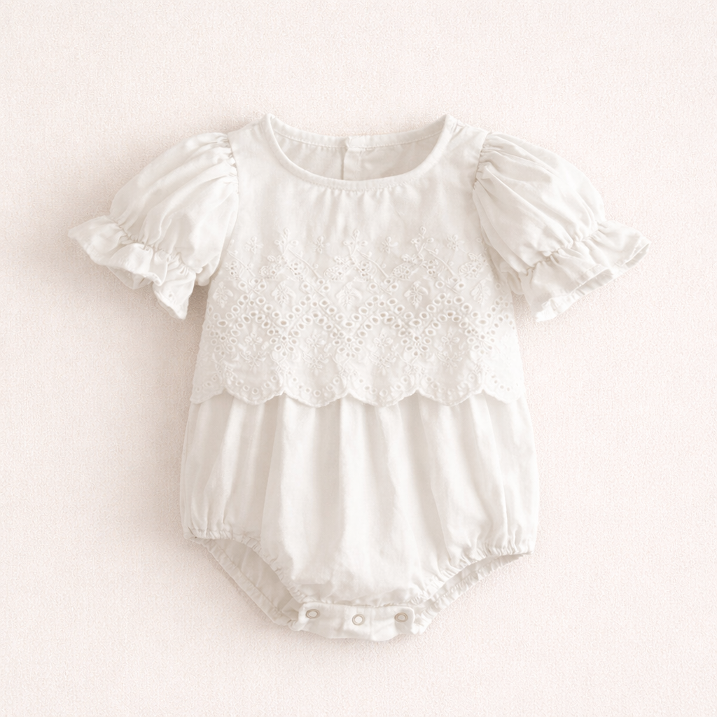 Confeccionado en un suave y ligero tejido, este pelele se caracteriza por su parte superior adornada con un hermoso bordado en detalle, que aporta un toque de sofisticación y elegancia. Las mangas cortas con sutiles volantes añaden un toque femenino y dulce, mientras que el ajuste elástico en la parte inferior proporciona comodidad adicional.