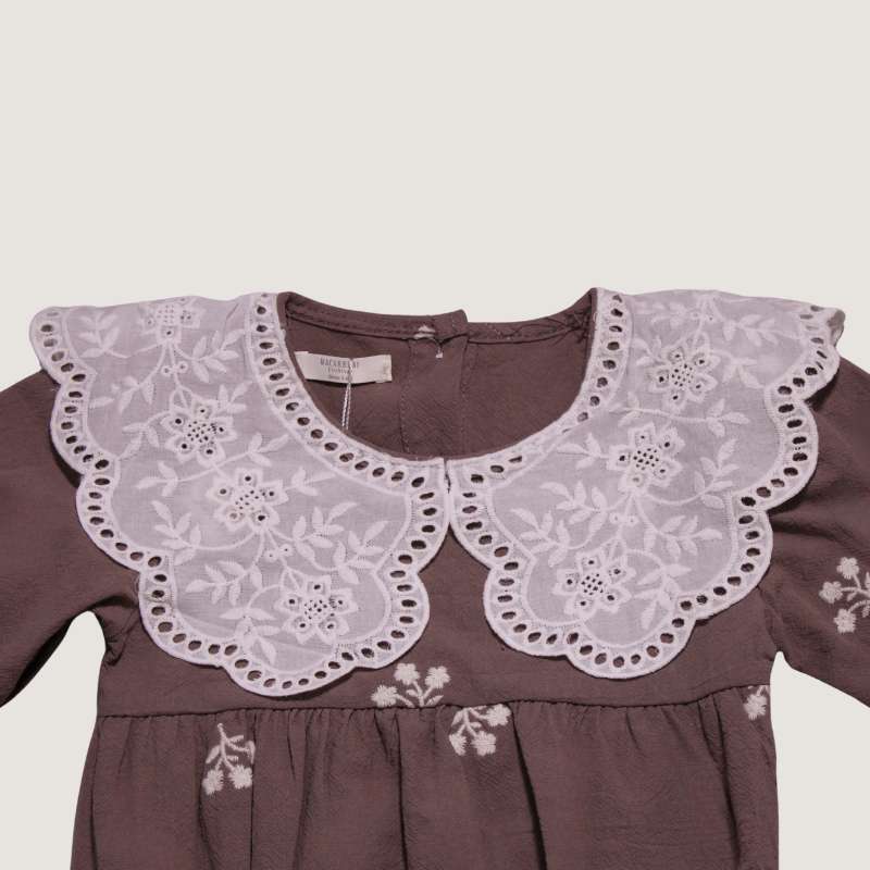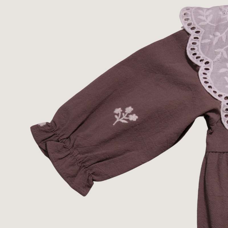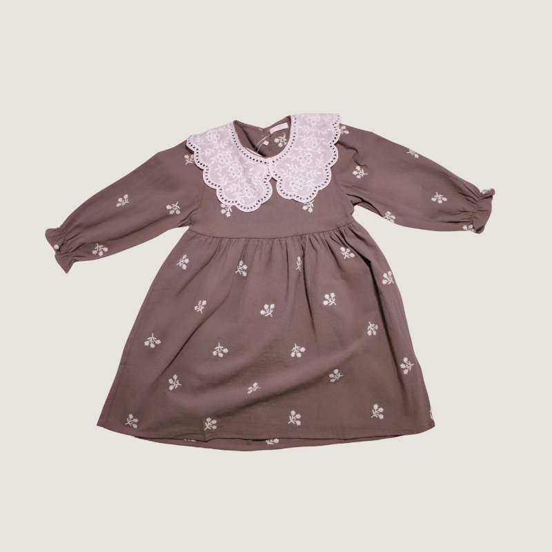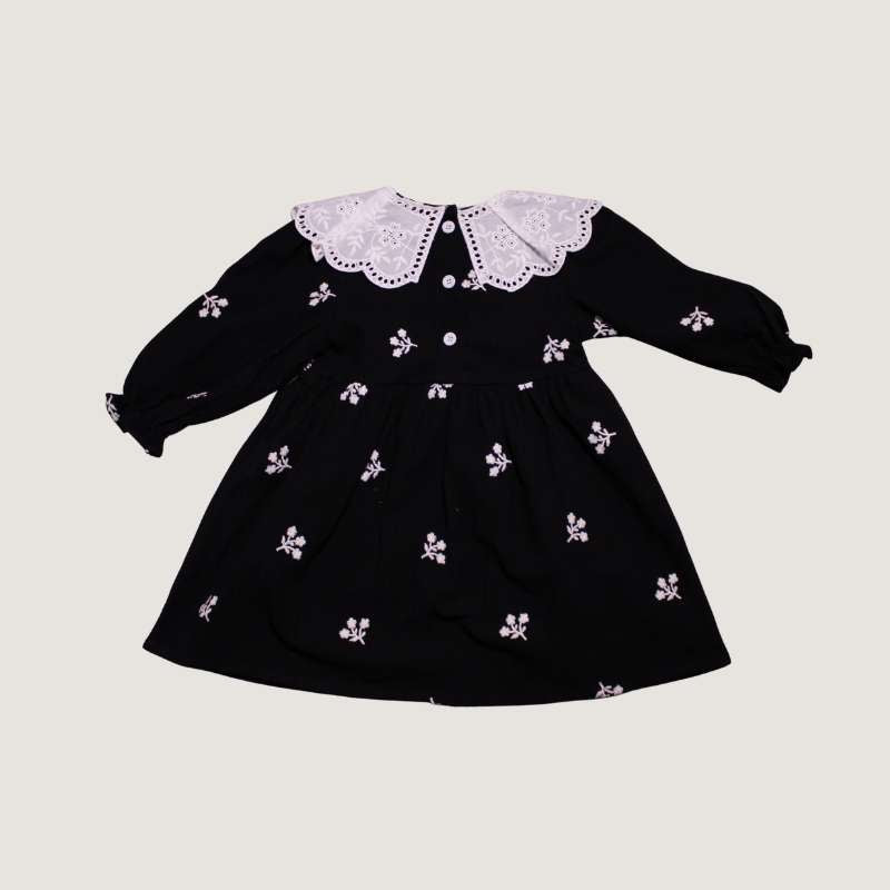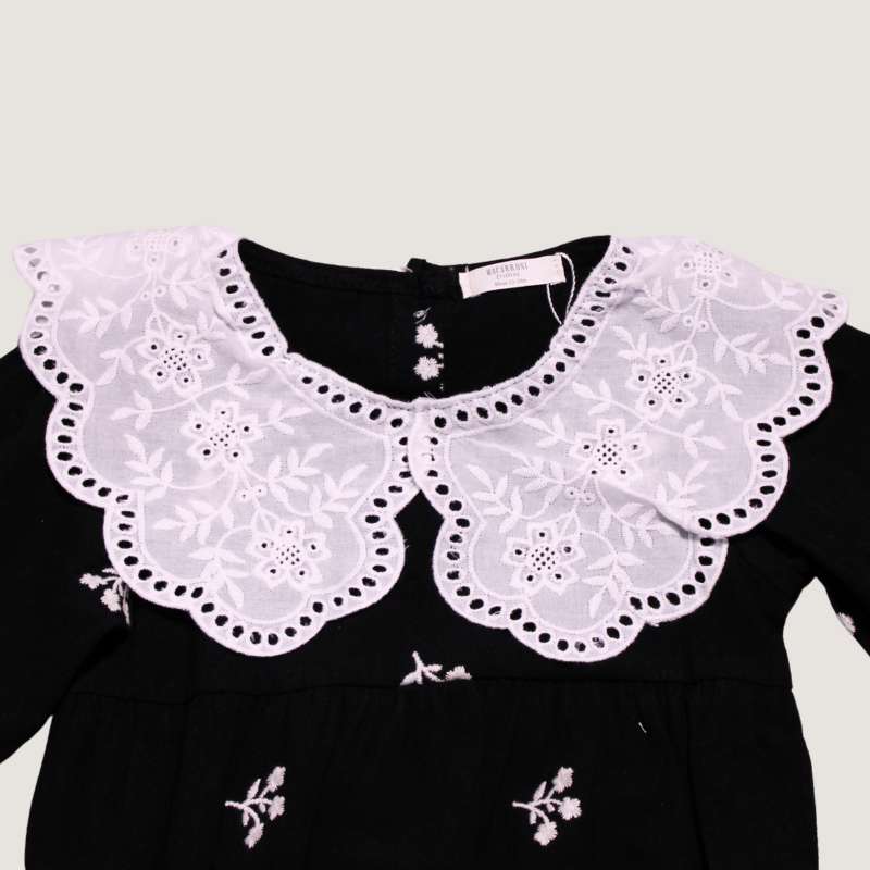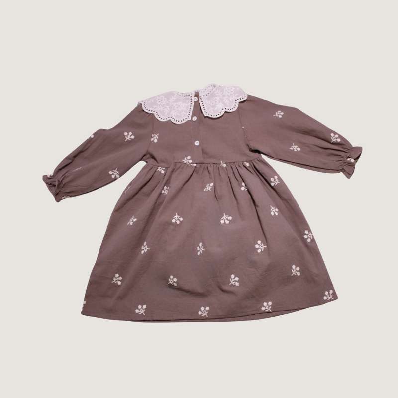 Un vestido encantador que destaca por sus delicados bordados y un cuello de encaje blanco con diseño floral que aporta un aire romántico y especial. Confeccionado en 100% algodón suave y cálido, está disponible en dos elegantes colores: negro clásico y kaki terroso, perfectos para la temporada.